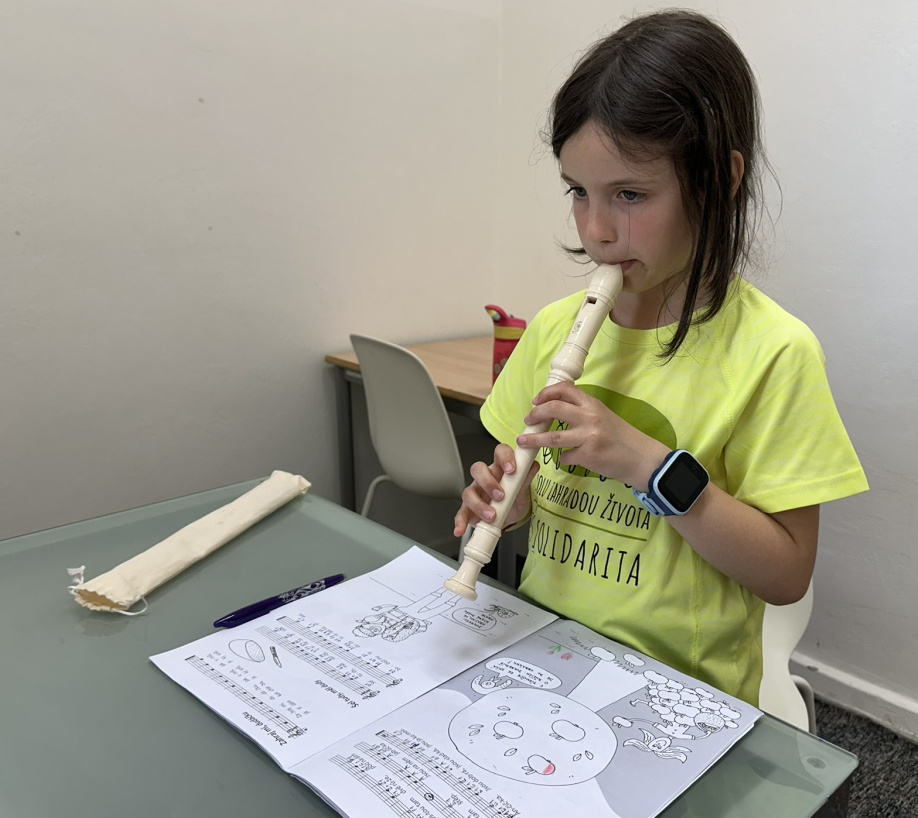 Na základní škole se děti naučí několik prvních hmatů na flétnu (v případě úplných začátečníků) a s pomocí našeho lektora si zahrají známé i neznámé písničky. Ti starší a zvídavější se naučí přečíst noty a zahrát samostatně. V kroužku je kladen důraz na to, aby hraní na flétnu nebylo pro děti nepříjemnou povinností. Našim cílem je přirozená radost z muziky a láska k hudbě na celý život.