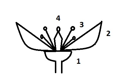 1 květní lůžko, 2 okvětí 3 tyčinky, 4 pestík
