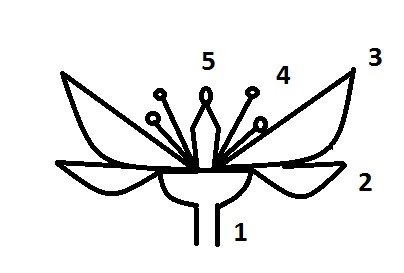 1 květní lůžko, 2 kalich, 3 koruna, 4 tyčinky, 5 pestík