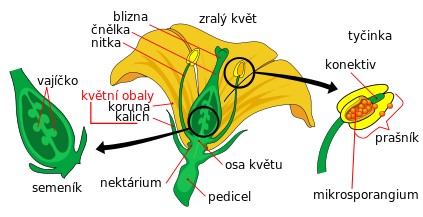 Obrázek Mature flower diagram cs od Mariana Ruiz LadyofHats, translated to Czech language by Michal Maňas (User:Snek01) [Public Domain] via Wikimedia Commons