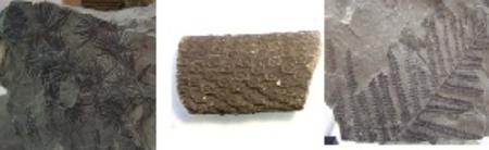 Ukázka prvohorních rostlinných fosilií (plavuně, přesličky a kapradiny)