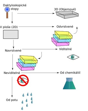 2.Daktyloskopická stopa vznikne tak, že na papilární linie se přenese látka z povrchu předmětu, a tím dojde k porušení povrchové struktury nosiče stopy – odvrstvená daktyloskopická stopa (stopy v prachu, čerstvé nátěry, krev, barviva).