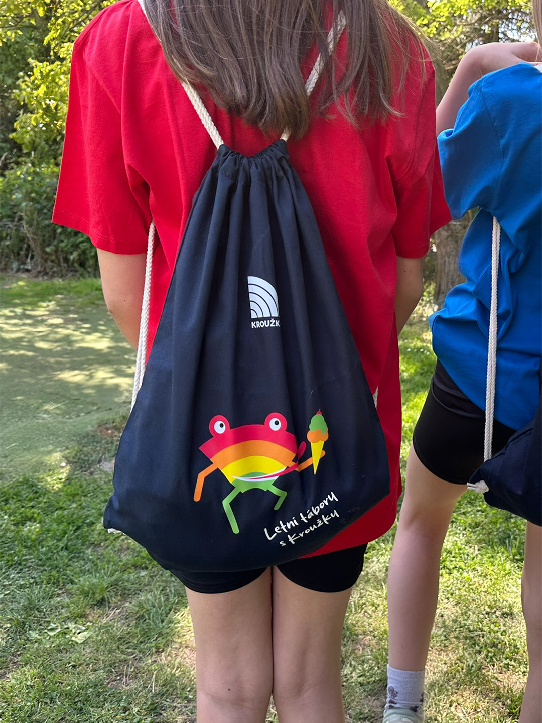 Černé krátké legíny pro holky s žábou a nápisem "Letní tábory s Kroužky"